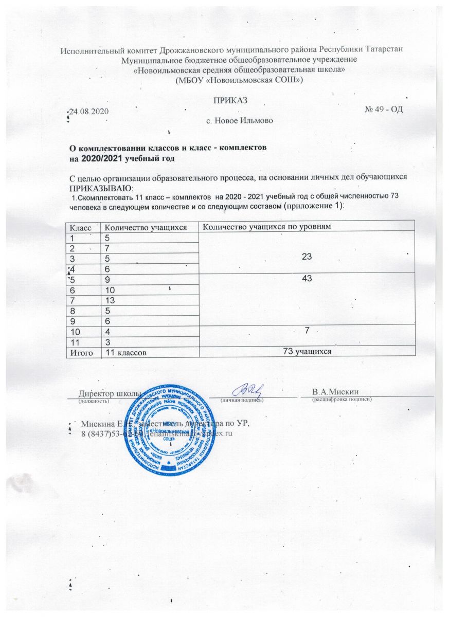 Приказ "О комплектовании классов и класс - комплектов на 2020/2021 учебный год"