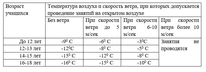 Кроме того, занятия по физкультуре в зимний период на открытом воздухе, согласно санитарным нормам и правилам, допускаются для учеников младших классов лишь при температуре воздуха не ниже трех градусов мороза и скорости ветра не более 6-10 метров в секунду, для старшеклассников - не ниже минус 10 градусов и ветре не сильнее 6-10 метров в секунду.