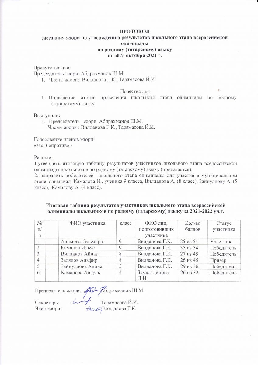 Протокол олимпиады по родному (татарскому) языку
