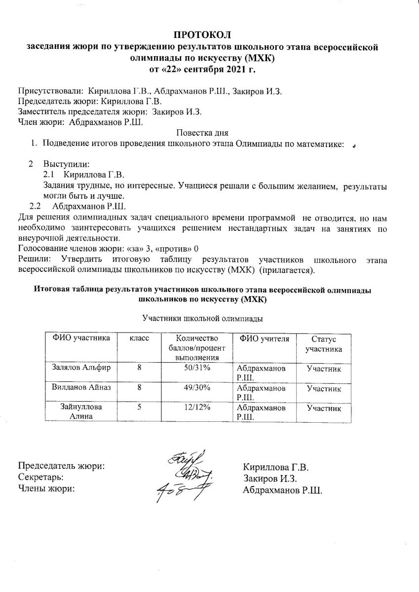 Протокол олимпиады по искусству