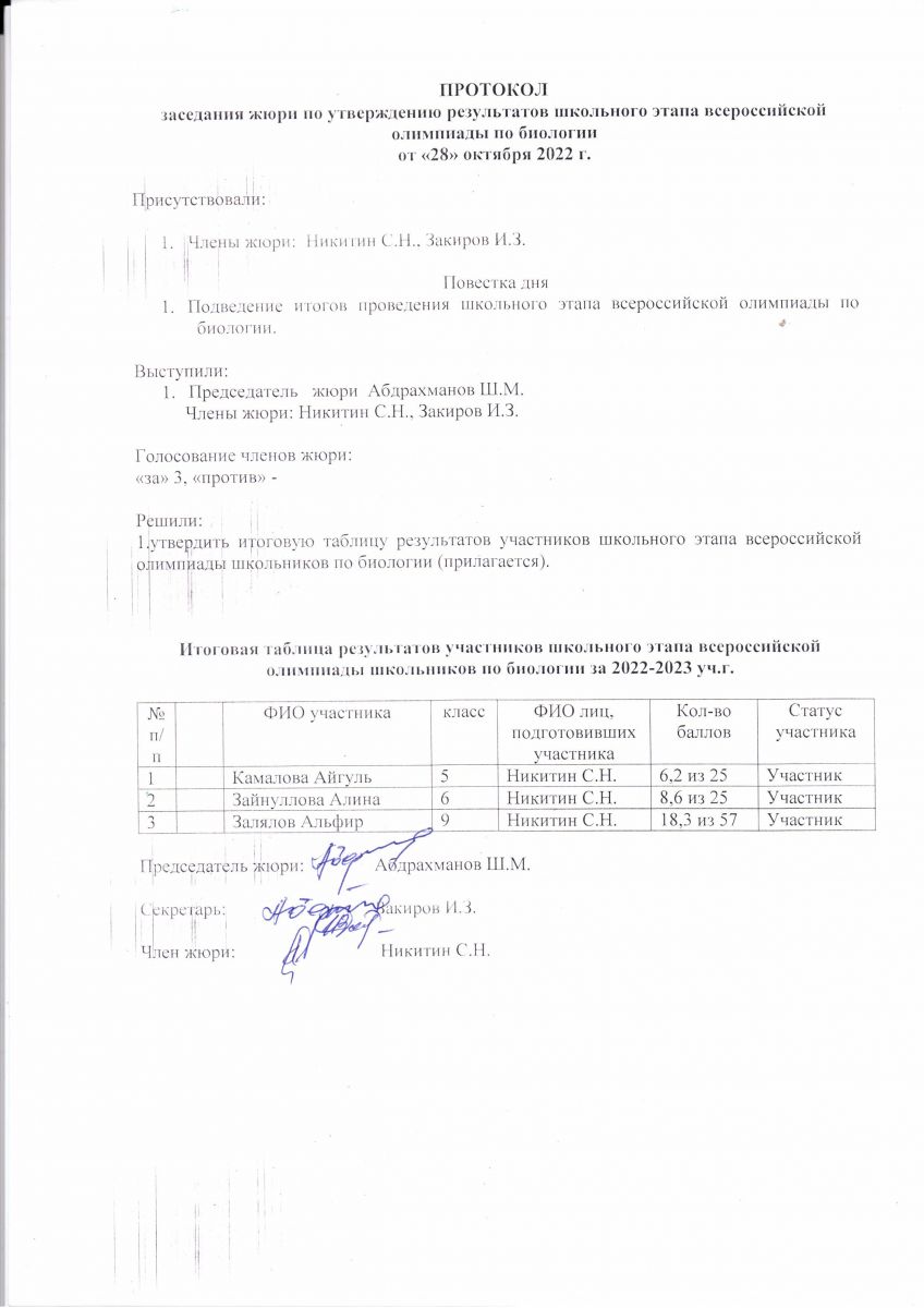 Протокол школьного этапа всероссийской олимпиады по биологии
