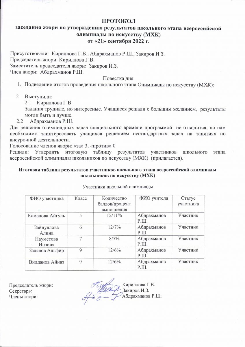Протокол школьного этапа всероссийской олимпиады по искусству (МХК)