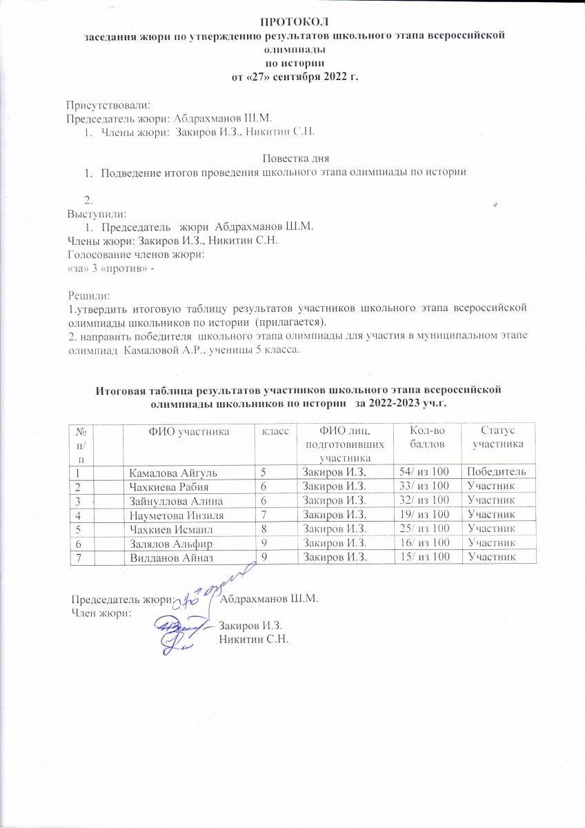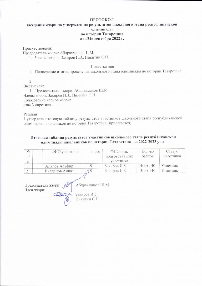 Протокол школьного этапа республиканской олимпиады по истории Татарстана