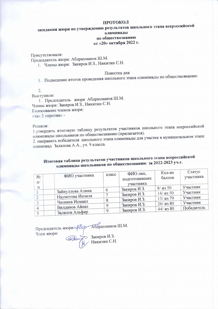 Протокол школьного этапа всероссийской олимпиады по обществознанию