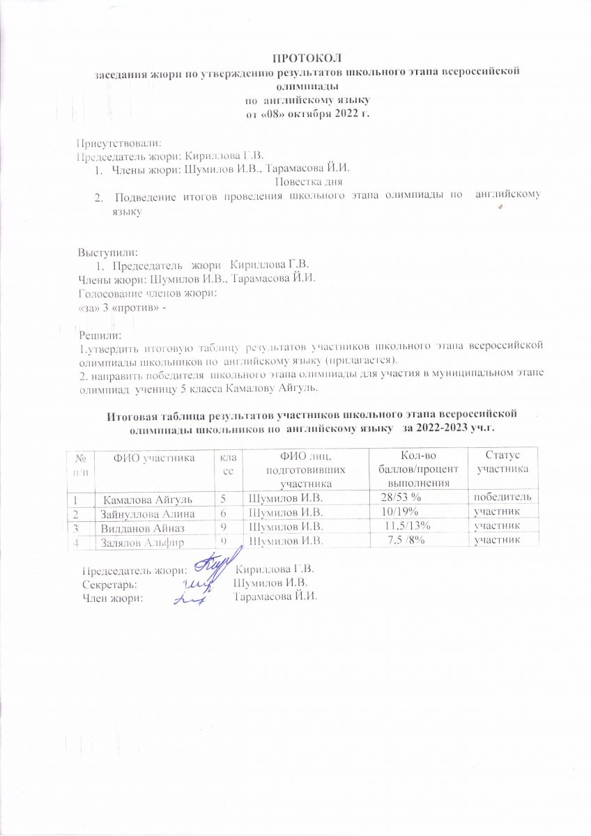 Протокол школьного этапа всероссийской олимпиады по английскому языку
