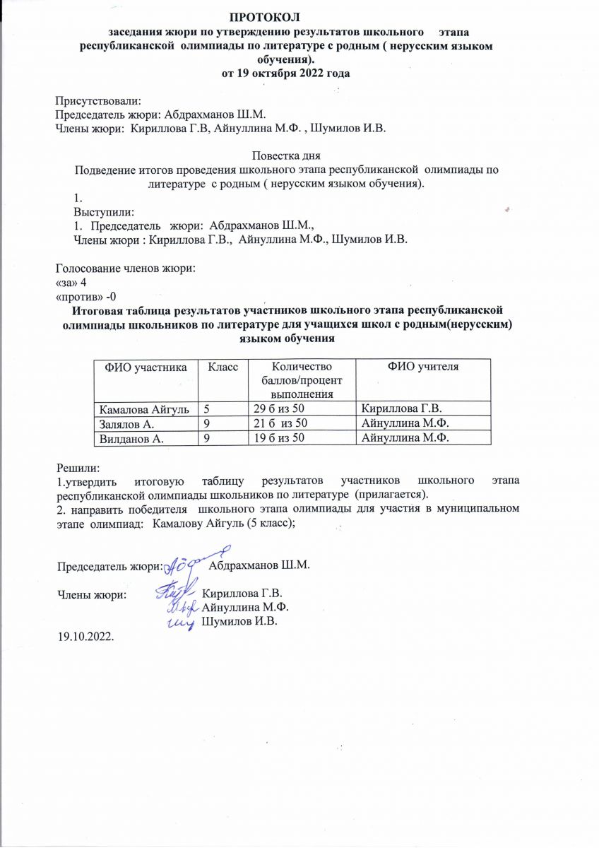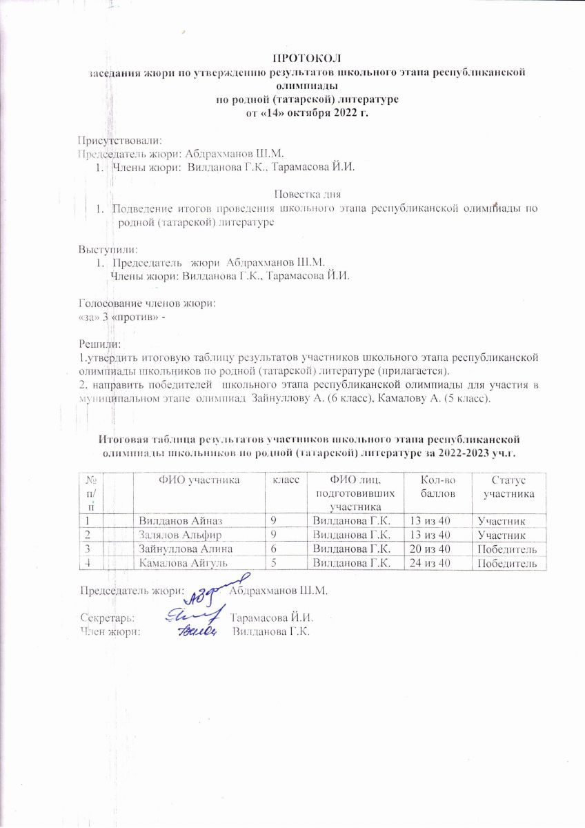 Протокол школьного этапа республиканской олимпиады по родной (татарской) литературе
