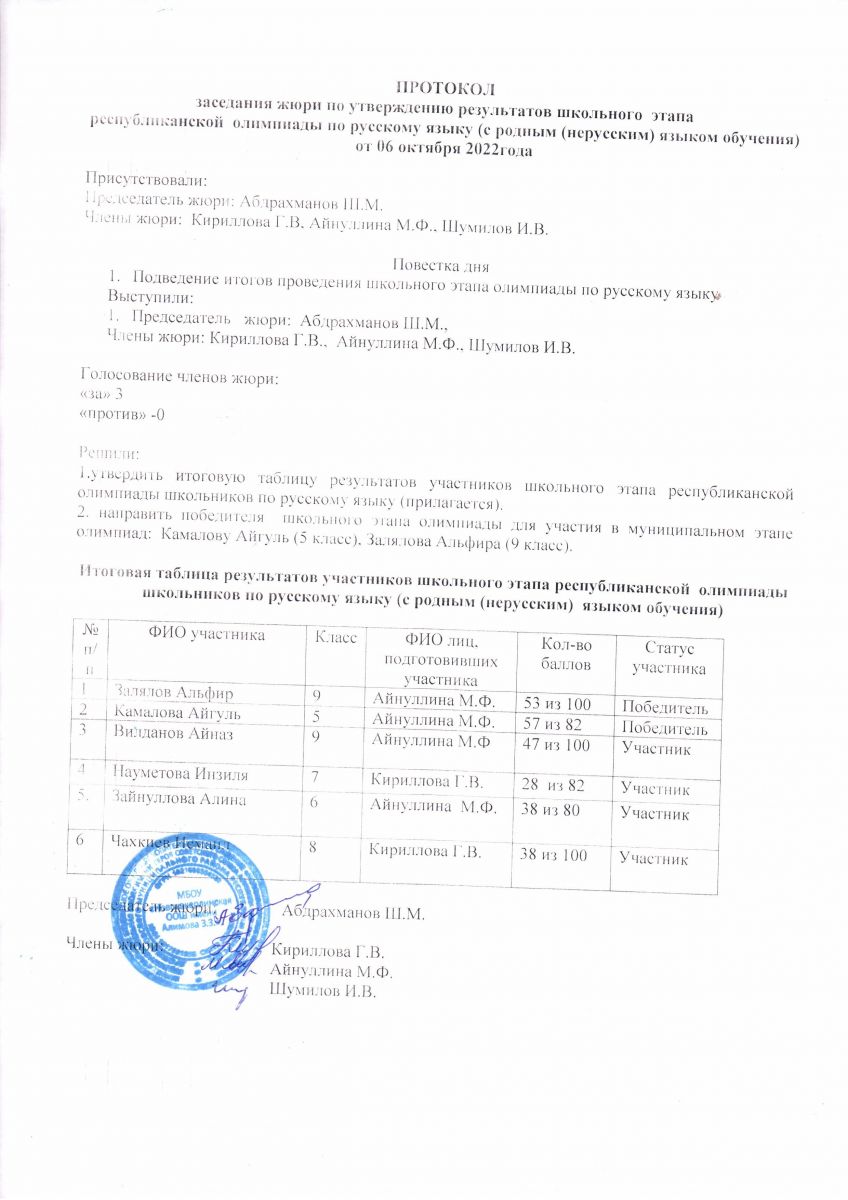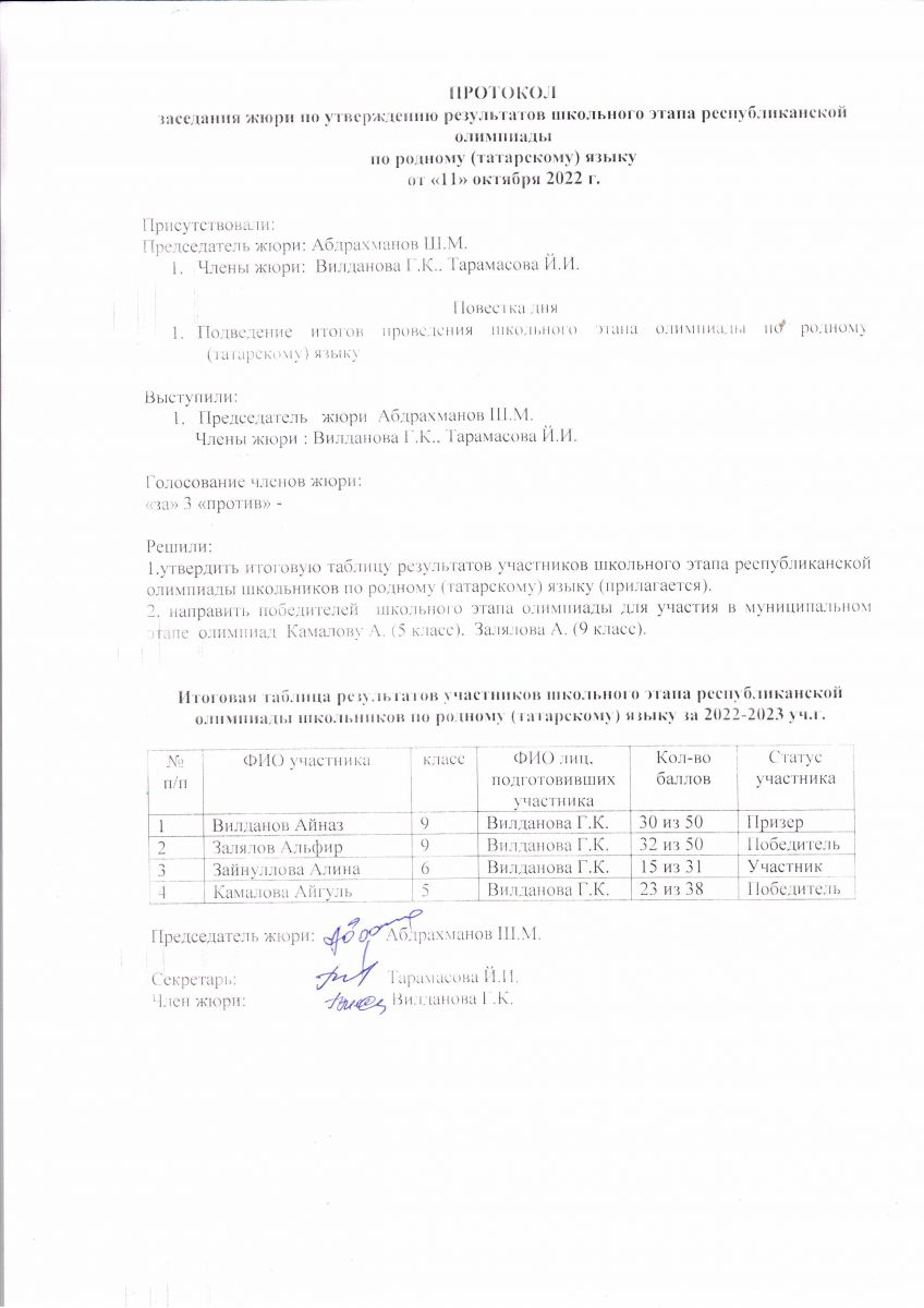 Протокол школьного этапа республиканской олимпиады по родному (татарскому) языку