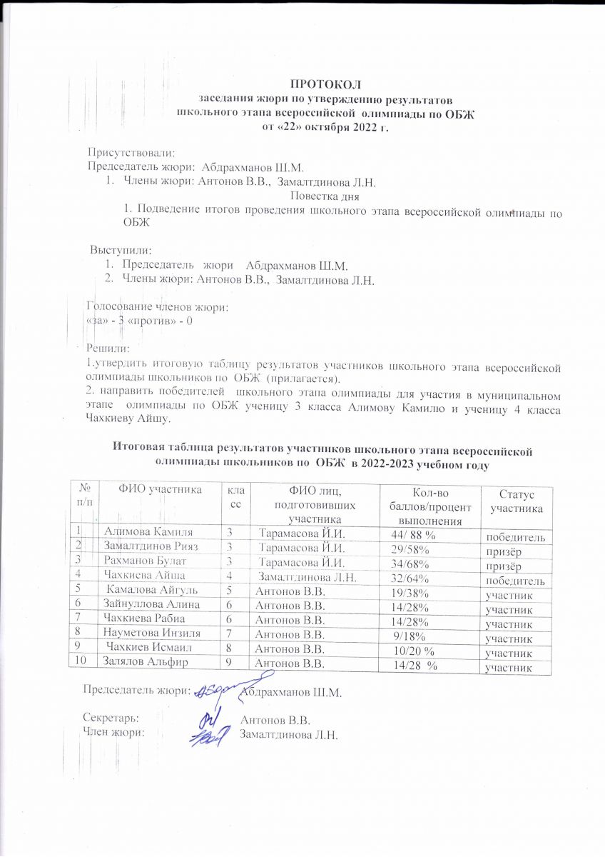 Протокол школьного этапа всероссийской олимпиады по ОБЖ