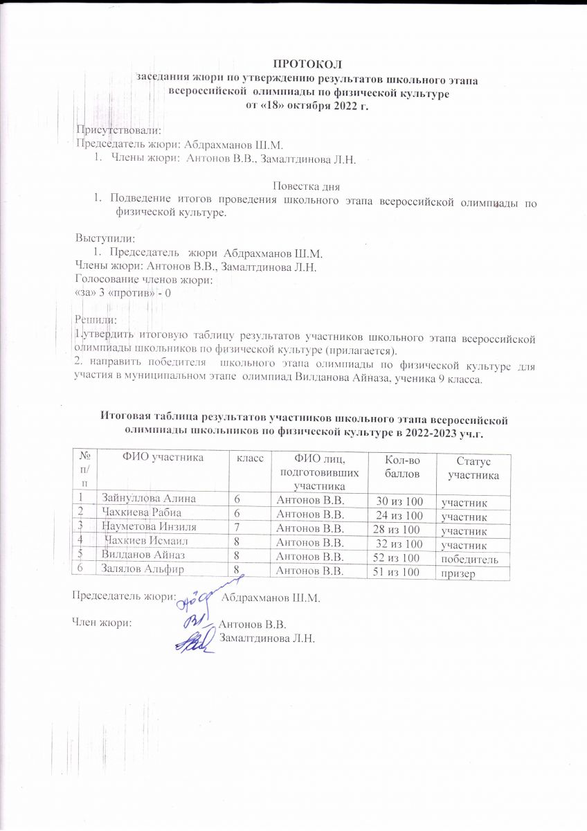 Протокол школьного этапа всероссийской олимпиады по физической культуре