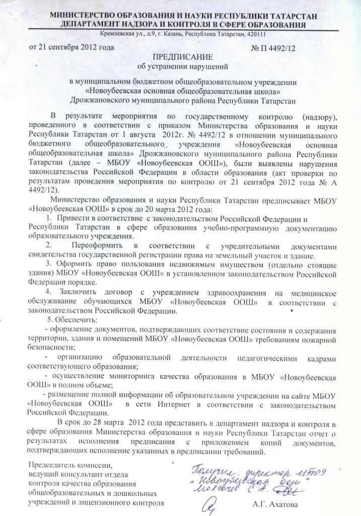 Предписание №П4492/12 от 21 сентября 2012 года "Об устранении нарушений в области образования"