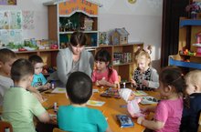Балалар бакчасында бүген кисеп ябыштыру эшләре белән шөгыльләнәбез. Барысы да нидер эшли, нидер кисә һәм аларга бу бик рәхәт.