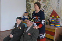Сегодня мы пригласили в детский сад ветеранов войны Бикчурова С.З. и Фахрутдинова А.М. Они со слезами на глазах рассказывали как прошли всю войну и остались живыми. Но в то же время и порадовались за наше красивое детство, за нашу счатливую жизнь. А дети рассказали стихи, спели военные песни. но и станцевали.