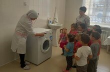 Ильмира Иршатовна познакомила детей с оборудованием прачечной, объяснила назначение и функции стиральной машины -облегчающий труд прачки, сушилки для белья и показала как гладить утюгом бельё.
