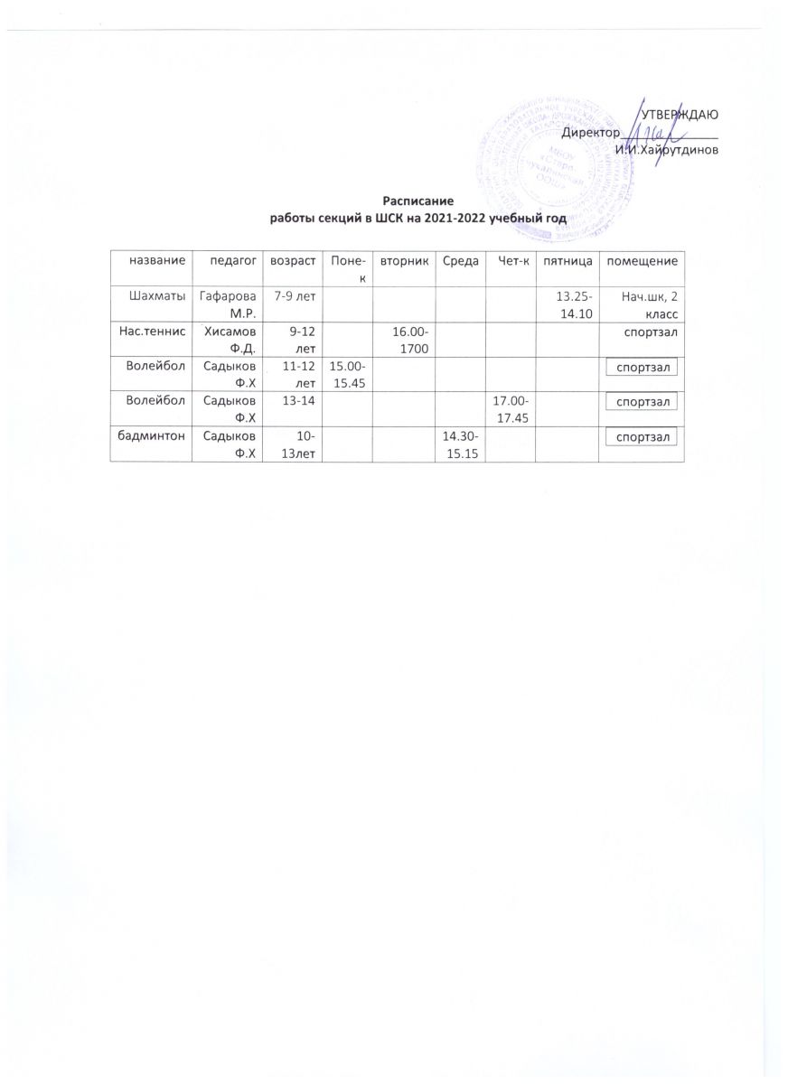 Календарный план работы ШСК на 2021-2022 учебный год.
