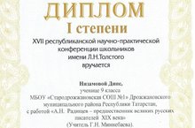 Ежегодно в республике проводятся различные конкурсы и конференции школьников. Недавно прошла XVII – ая научно-практическая конференция школьников имени Л. Н. Толстого, где принимала участие ученица 9 б класса Низамова Дина. Она удивила всех своим содержательным выступлением и заняла первое место. Была награждена Дипломом первой степени (учитель Миннебаева Г. Н.)