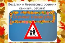 Дорогие ребята и уважаемые родители! Сообщаем вам, что осенние каникулы продлятся с 28 октября по 6 ноября 2023 года. Правила безопасности во время осенних каникул! Во время осенних каникул не стоит забывать о правилах безопасности! Осень – это короткий день и быстрое наступление темноты. Поэтому будьте особенно внимательны! В темноте в непогоду нелегко и водителям – свет автомобильных фар отражается в лужах, на мокром асфальте и дезориентирует водителей. Поэтому очень важно использовать светоотражающие приспособления. Прикрепите их на одежду, головной убор, портфель, ранец, сумку, и водитель увидит вас. Если ничего подобного нет, воспользуйтесь фонариком, освещая дорогу впереди себя.
