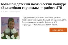 Ученица нашей школы Калимуллина Талия участвует на V Большом детском поэтическом конкурсе «Волшебная скрижаль». Она представила поэтическое произведение читающей публике, издателям, журналистам и критикам. Работа Талии опубликована в сети Интернет. Идет голосование. Профессиональные поэты, прозаики, журналисты, специалисты в области критики, литературоведения, языкознания подводят итоги. Желаем Талие победы и творческих успехов!