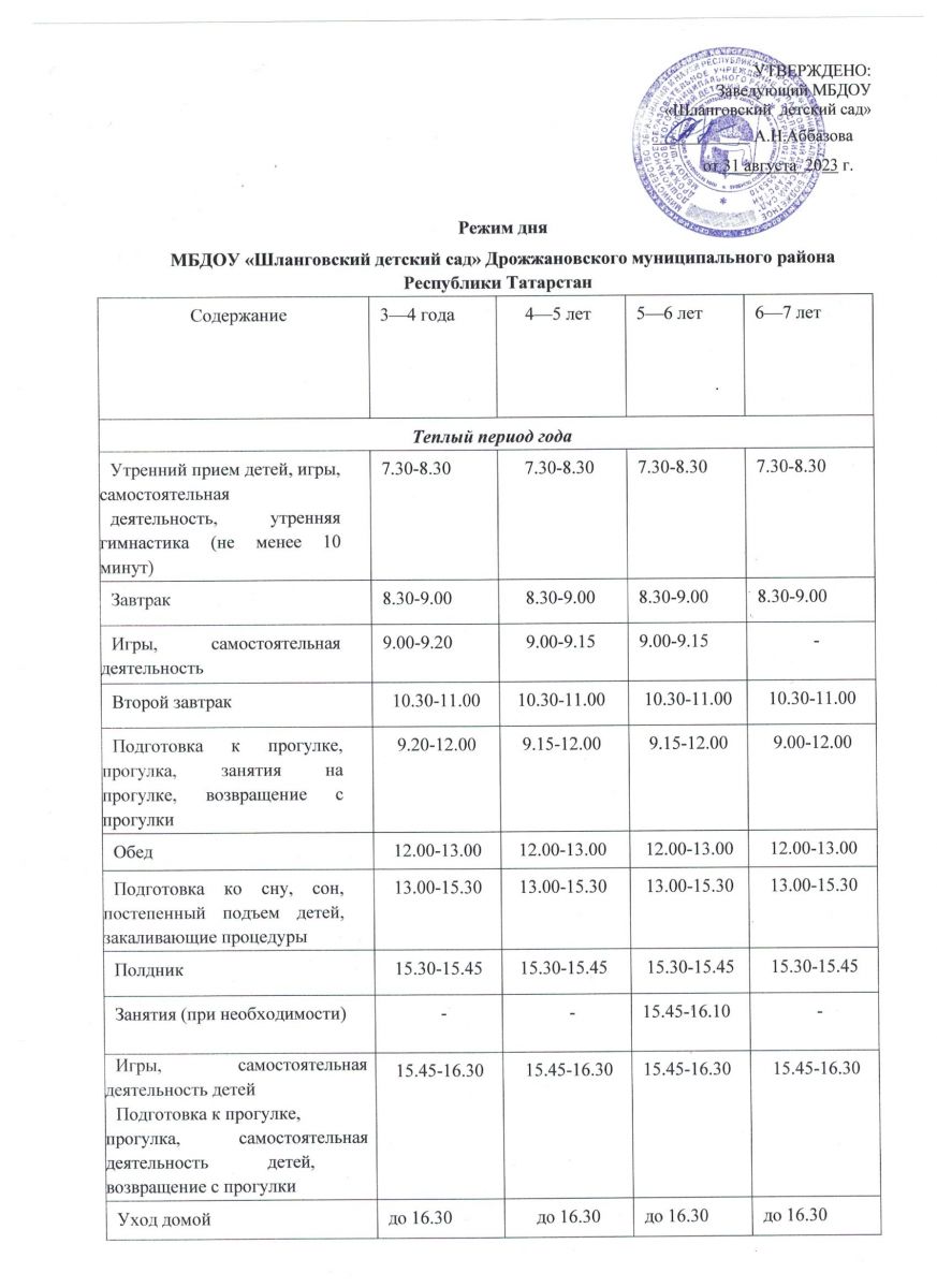 Режим дня на летний оздоровительный период на 2023-2024 год в МБДОУ "Шланговский детский сад"