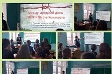 Учитель истории Бакирова В.Ф. провела урок, посвященный ко Дню памяти жертв Холокоста. Она рассказала учащимся о роли Красной Армии в освобождении лагеря смерти «Аушвиц» (Освенцим).