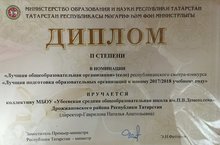 Результаты смотра-конкурса «Лучшая подготовка образовательных организаций к новому 2017-2018 учебному году» 03.12.2017 Коллективу МБОУ «Убеевская средняя общеобразовательная школа имени П.В. Дементьева» вручены диплом и сертификат Министерства образования и науки РТ в номинации «Лучшая подготовка образовательных организаций к новому 2017-2018 учебному году».