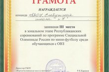 21 апреля в с.Верхние Челны, Нижнекамского района (ГБОУ "Верхнечелнинская школа-интернат") состоялся зональный этап по мини-футболу Республикаских соревнований для обучающихся учреждений для детей с ОВЗ в рамках Специальной Олимпиады России. В соревнованиях принимали участие 9 команд из городов Наб.Челны, Нижнекамск, Заинск, Мамадыш. По результатам игры места распределились следующим образом: первое место - команда из Наб.Челнов, второе - Мамадыш, мы заняли третье место! Поздравляем нашу команду и желаем дальнейших спортивных успехов!