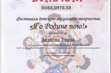 Ученица 7 класса Заляева Элина принимала участие в фестивале детского вокального творчества "Я о Родине пою", педагог Мажуренко Н.Н.. В конкурсе принимало участие очень много учащихся, но Элина очень достойно выступила и была удостоена диплома победителя. Поздравляем Элину и Наталью Николаевну, желаем дальнейших успехов!