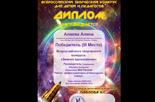 Поздравляем Алиеву Алину (руководитель Овчинникова М.А.), занявшую III место во Всероссийском творческом конкурсе "Зимнее вдохновение", номинация "Рисунок".