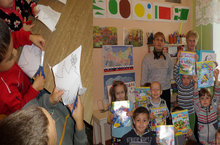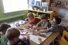 Коллективная форма организации дает возможность каждому ребенку формировать умения и навыки работать вместе, строить общение, развивать привычку к взаимопомощи. Создание общих картин, где обьединяются изображения всех детей группы, вызывают у них восхищение и радость. Күмәк эшләү һәр балага бергә эшләргә, аралаша белергә өйрәтә, узара ярдәм итү гадәтен үстерә. Барлык балаларның сүрәтләрен берләштерә торган уртак картиналар булдыру зур шатлык китерә.
