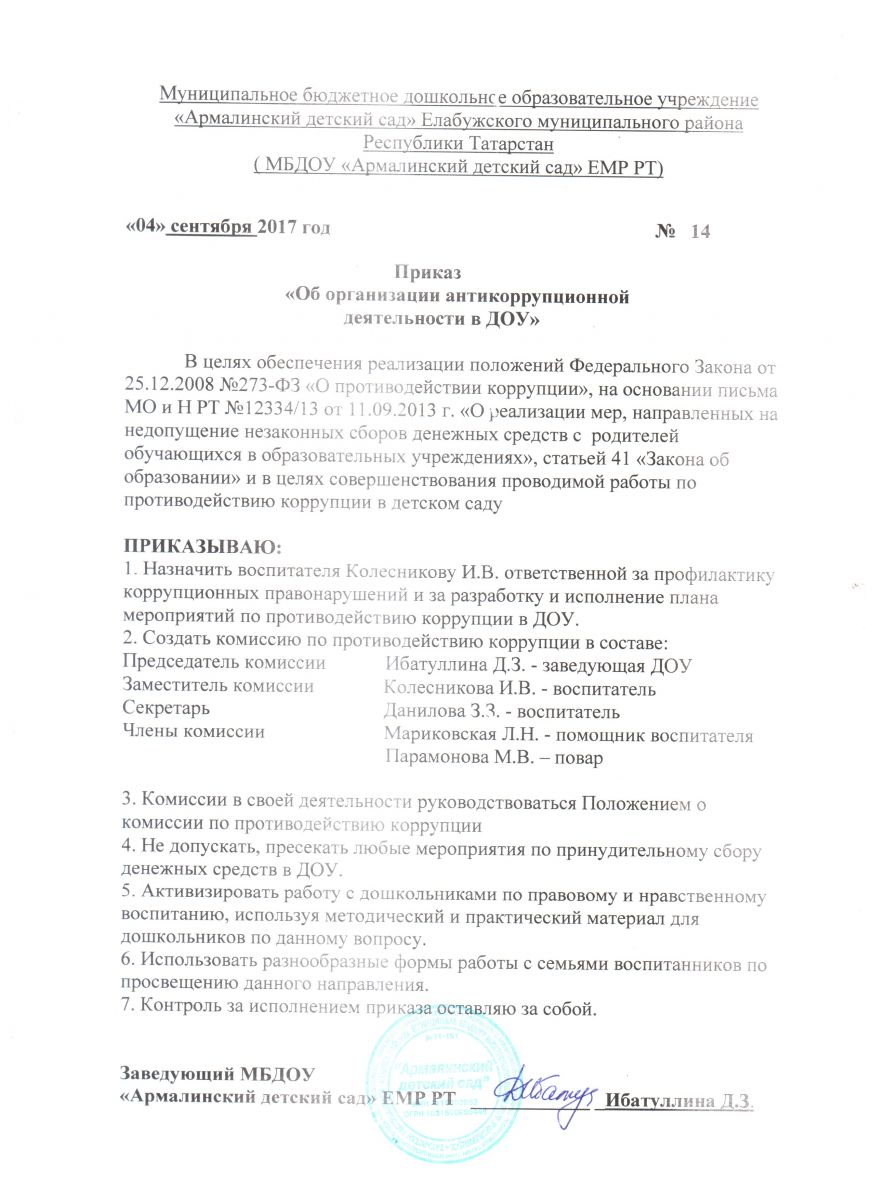 Приказ об организации антикоррупционной деятельности в ДОУ