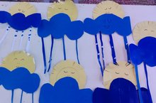 Аппликация "Тучка и солнышко" 05.06.2019 - Где ночует солнце? - У бабушки в постельке. - А кто его бабушка? - Синее небо. - Чем оно укроется? - Шерстяной тучкой. - А кто его укроет? - Дедушка ветер. - Кояш кайда куна? - Әбинең урын өстендә. - Ә әби кем? - Күк зәңгәр. - Ул нәрсә ябылачак? - Йонлы тучка. - Ә аны кем ябыр? - Бабай җил.
