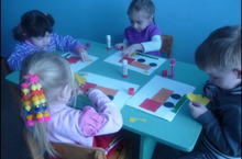 Детям предлагается из геометрических фигур собрать грузовика. Квадрат похож на кабину, прямугольник- на кузов, круг- на колесо. Они самостоятельно собирают грузовик из фигур на своих листах бумаги.