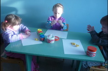 Мастер из Дымково дал фигуру лошадки и попросил ее украсить кужочками и точками. Детишки рисуют кружочки и точки тычком- палочкой намотанной на нее ватой.