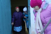Учащиеся школы ходили на шефскую работу к Жихания эби. Оказали большую помощь, стаскали все сено с улицы в сарай, который мог остаться под снегом.