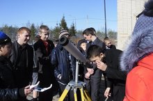 20 марта с13.15 до 14.00 учащиеся и учителя нашей школы наблюдали за частичным затмением Солнца. Смотрели через затемненное стекло и телескоп с затемненным объективом.