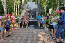 Балалар 1941-1445 елларда фашизмга каршы көрәштә тынычлыкны һәм азатлыкны саклап калган авылдашлар истәлегенә куелган һәйкәлгә чәчәкләр салдылар.