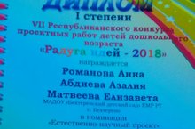 Диплом первой степени в республиканском конкурсе проектных работ детей дошкольного возраста. Поздравляем наших воспитанников и воспитателей. Желаем дальнейших успехов!