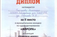 Диплом за II место в муниципальном конкурсе по судомоделированию "АВРОРА"