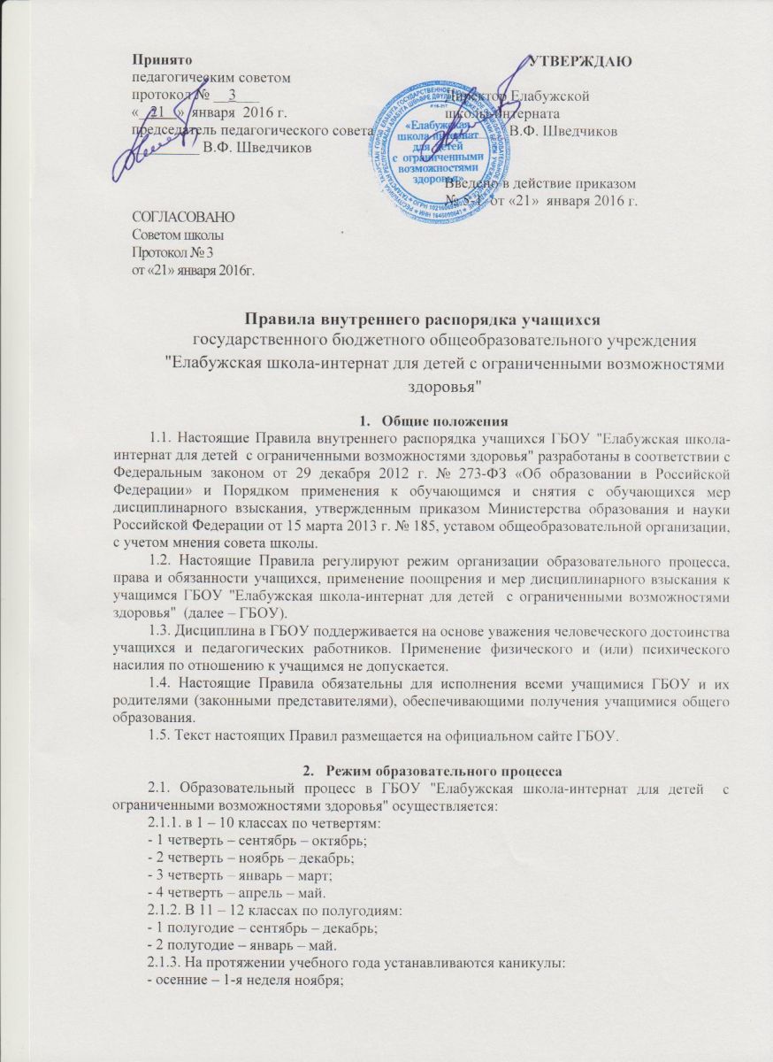 Положение о порядке оформления возникновения, приостановления и прекращения отношений между государственным бюджетным общеобразовательным учреждением «Елабужская школа-интернат для детей с ограниченными возможностями здоровья» и обучающимися, и (или) родителями (законными представителями) несовершеннолетних обучающихся