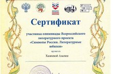 Төрле олимпиадаларда һәм конкурсларда актив катнашучы Хаҗиева Азалия «Россия символлары " Бөтенроссия әдәби проекты олимпиадасында катнашты. Әдәби проектлар»