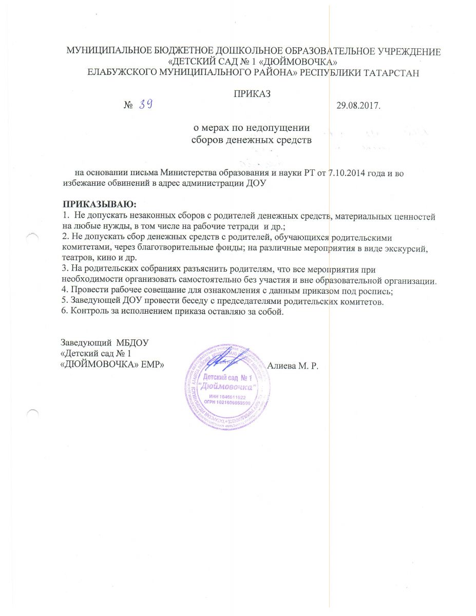 Приказ "о мерах по не допущению сбора денежных средств в ДОУ" №39 от 29.07.2017г.