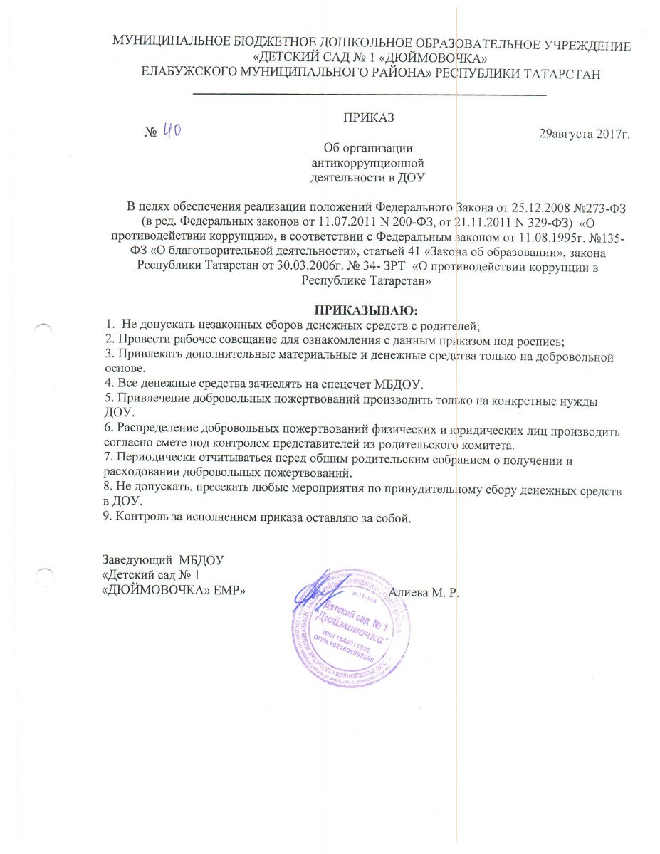 Приказ "об организации антикоррупционной деятельности в ДОУ" № 40 от 29.08.2017г.