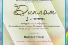 Воспитанник подготовительной группы Путинцев Михаил принял участие в конкурсе чтецов "Радуга доброречия", который проходил в рамках Всероссийского открытого фестиваля "Новые горизонты" в г. Набережные Челны. Он замечательно прочитал произведение "Волшебное слово", за что был награжден Дипломом первой степени. Гордимся нашим победителем!