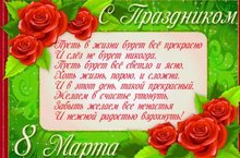 Сердечно поздравляем вас с весенним праздником- 8 Марта!В этот день примите самые теплые и нежные пожелания!Пусть ваша жизнь будет наполнена яркими впечатлениями,Пусть всегда будет повод для прекрасной улыбки.От всей души желаю доброго здоровья!Бодрости духа и огромного счастья!Будьте красивыми, восхитительнымиИ любимыми!!!