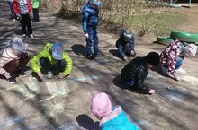 Рисует малыш на асфальте мелкамиЗеленую травку и дом.Деревья и солнце рисует мазкамиИ радость струится кругом.В старшей и подготовительной группах дети рисовали нашу планету, каким они хотят видеть. Свои рисунки старшая группа раздавала на улице микрорайона. Дети средней группы путешествовали по экологической тропе к березовой роще. Беседовали о белостволой красавицы весной, узнали о пользе березового сока, о способах его добычи без вретнида для дерева. Младшие дошкольники наблюдали за трудом взрослых: за уборкой на территории ДОУ, на цветниках, за пересадкой герани черенками. -