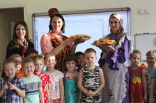 Группа «Растишки» принимала гостей народной татарской культуры. Дети знакомились с бытом, кухней и играми народов Поволжья. В этом нам помогли наши замечательные родители: мама Павла – Екатерина Игоревна и мама Вероники – Альмира Ахметовна в татарских национальных костюмах. Детки с удовольствием играли в татарские, башкирские и удмуртские национальные игры, познакомились с культурой народов Поволжья, а также архитектурой. Закончилось мероприятие вкусным угощением татарской национальной кухни – эчпочмаком.