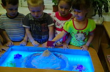 Дети средней группы Гномики окунулись в многообразный водный мир. При помощи волшебных свойств песка и света дети смогли изобразить подводное царство, выразив этим своё настроение, эмоции, позитив. Работа с песком помогает ребёнку снять эмоциональное напряжение и развивает воображение, поэтому детям нравится такой вид деятельности.