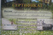Сертификат за активное участие в эколого-познавательной программе "В мире животных" 2013-2014 гг. 21.05.2014