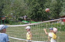 В летний оздоровительный период особое внимание уделяется здоровьесбережению воспитанников нашего детского сада. На спортивной площадке дети с удовольствием играют в подвижные игры с элементами спорта. Одна из любимых игр это детский волейбол.