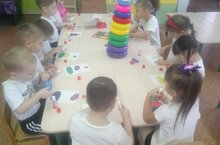 11 төркемдә "Кибеткә матур пирамидалар алып килделәр" дигән темага аппликация үткәрелде. Балалар турыпочмактан әйләнәне кисәргә һәм аларны иң зурдан иң кечкенәгә урнаштырырга өйрәнделәр.