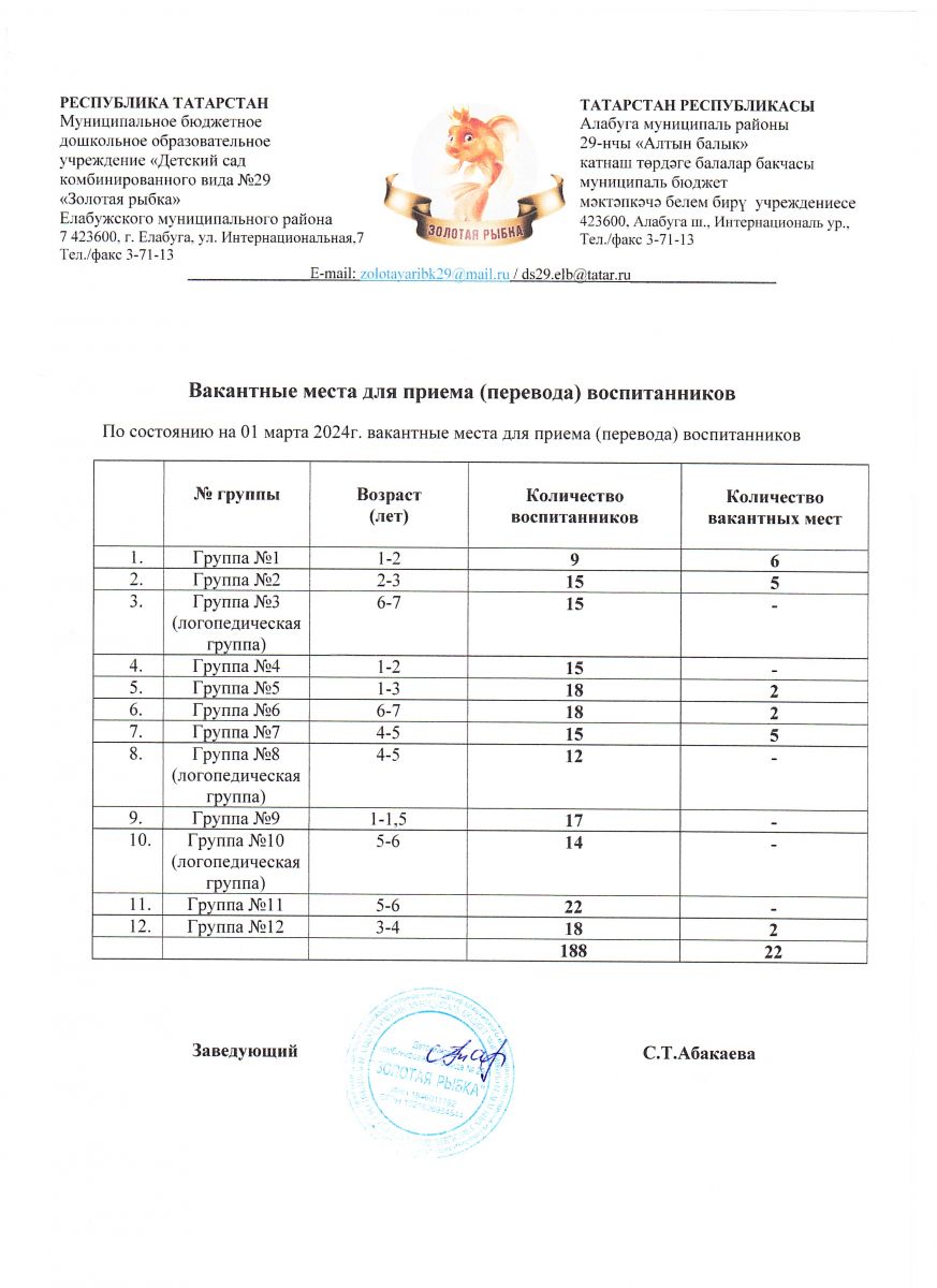 ВАКАНТНЫЕ МЕСТА ДЛЯ ПРИЕМА (ПЕРЕВОДА) ВОСПИТАННИКОВ/Балалар бакчасында тәрбияләнүчеләрне вакантлы урыннарга кабул итү (күчерү)